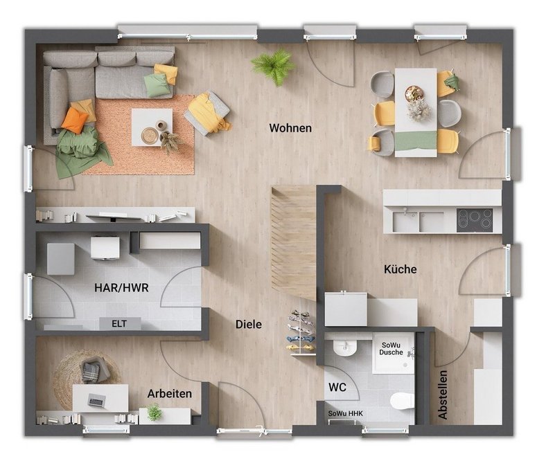 - gerade Treppe (zentral im Erdgeschoss, „teilt“ Koch- und Wohnbereich)
