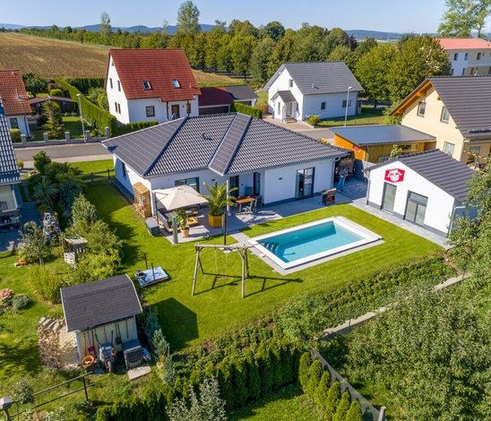 Das neue Leben im Winkelbungalow 108 bezeichnet der Hausbesitzer als „6er im Lotto“. Das sei einfach eine ganz andere Lebensqualität – auch, weil alles schon fertig war, als er im April 2019 einziehen konnte. Und das Beste daran, was ihm niemand so richtig glauben will: „Der Preis, der mir am Anfang genannt wurde, war zu hoch. Am Ende hatte ich sogar noch 20.000 Euro übrig. Davon habe ich dann die Garage und den Pool bauen lassen.“ Eine Kalkulation – auf den Cent genau!