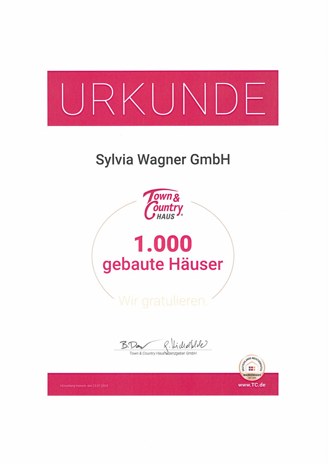 Sylvia Wagner GmbH, Lizenzpartner von Town & Country, erhält Auszeichnung für vorbildliche Bauqualität